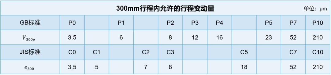 依據(jù)GB/T 17587.3-2017及參考JIS B1192-1997標(biāo)準(zhǔn)。滾珠絲杠的檢測項目主要為目標(biāo)行程公差、有效行程內(nèi)允許的行程變動量、300mm行程內(nèi)允許的行程變動量及2πrad內(nèi)允許的行程變動量??蛻粼跐L珠絲杠的選用中,目前一般采用300mm行程內(nèi)允許的行程變動量描述滾珠絲杠精度等級。變動量對照表如下: