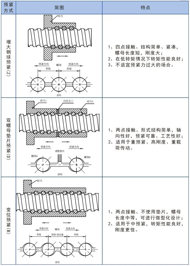 凱特精機(jī)滾珠絲杠副按預(yù)緊方式分為增大鋼球預(yù)緊(Z)、雙螺母墊片預(yù)緊(D)和變位預(yù)緊(B)