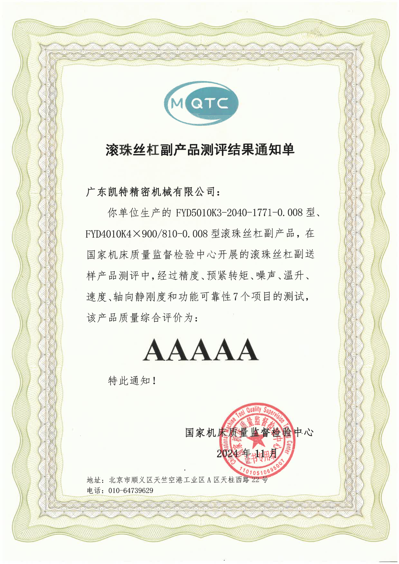 喜訊 | 凱特精機(jī)獲國家機(jī)床質(zhì)量監(jiān)督檢驗(yàn)中心《滾珠絲杠副產(chǎn)品測評結(jié)果通知單》5A評價(jià)