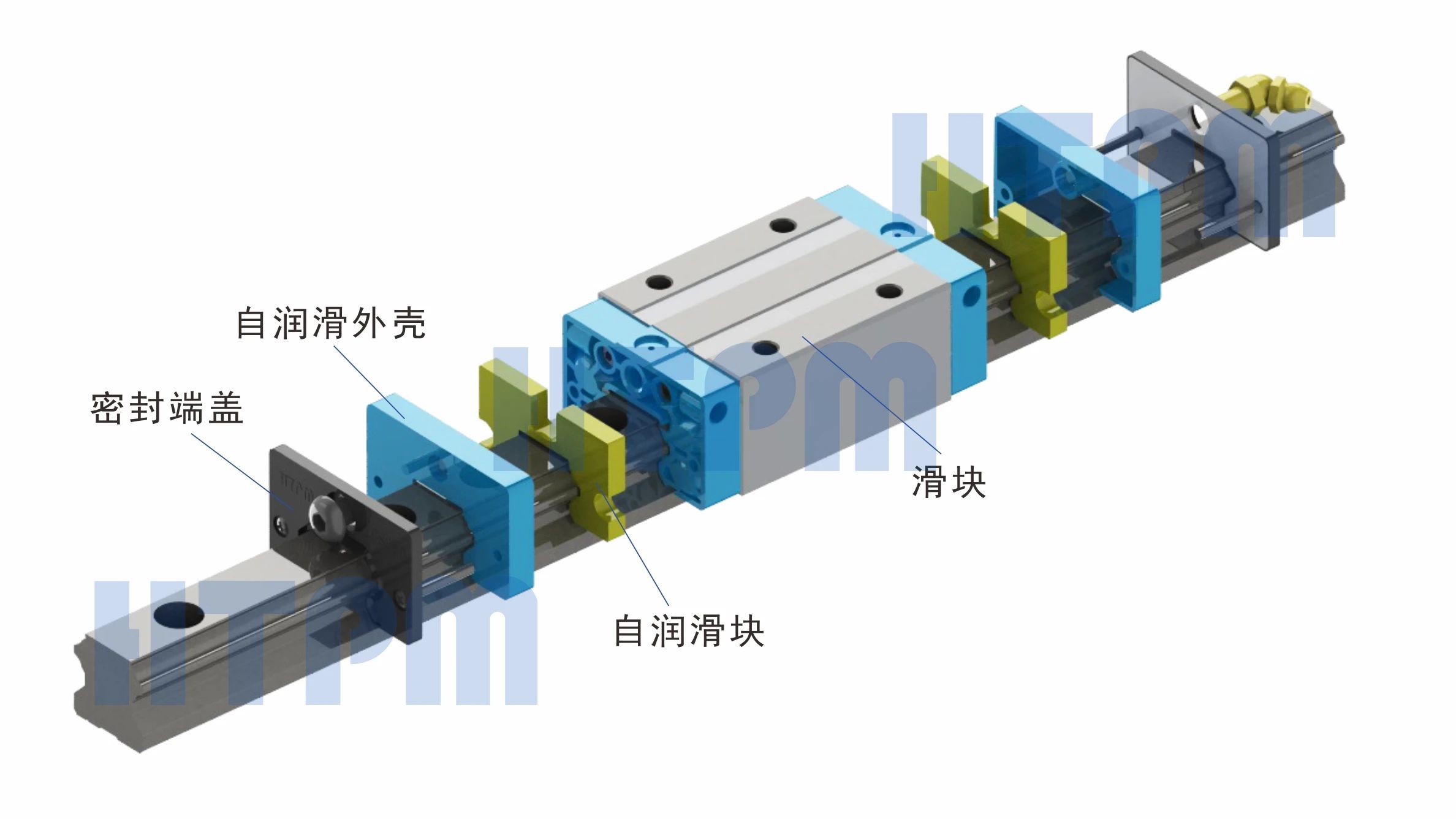 自潤滑塊是一種新型的多孔高分子材料與潤滑油脂一體成型的潤滑部件,安裝在滑塊兩端,通過與導(dǎo)軌溝槽面接觸,不間斷釋出新鮮的潤滑油,從而實(shí)現(xiàn)導(dǎo)軌副潤滑。