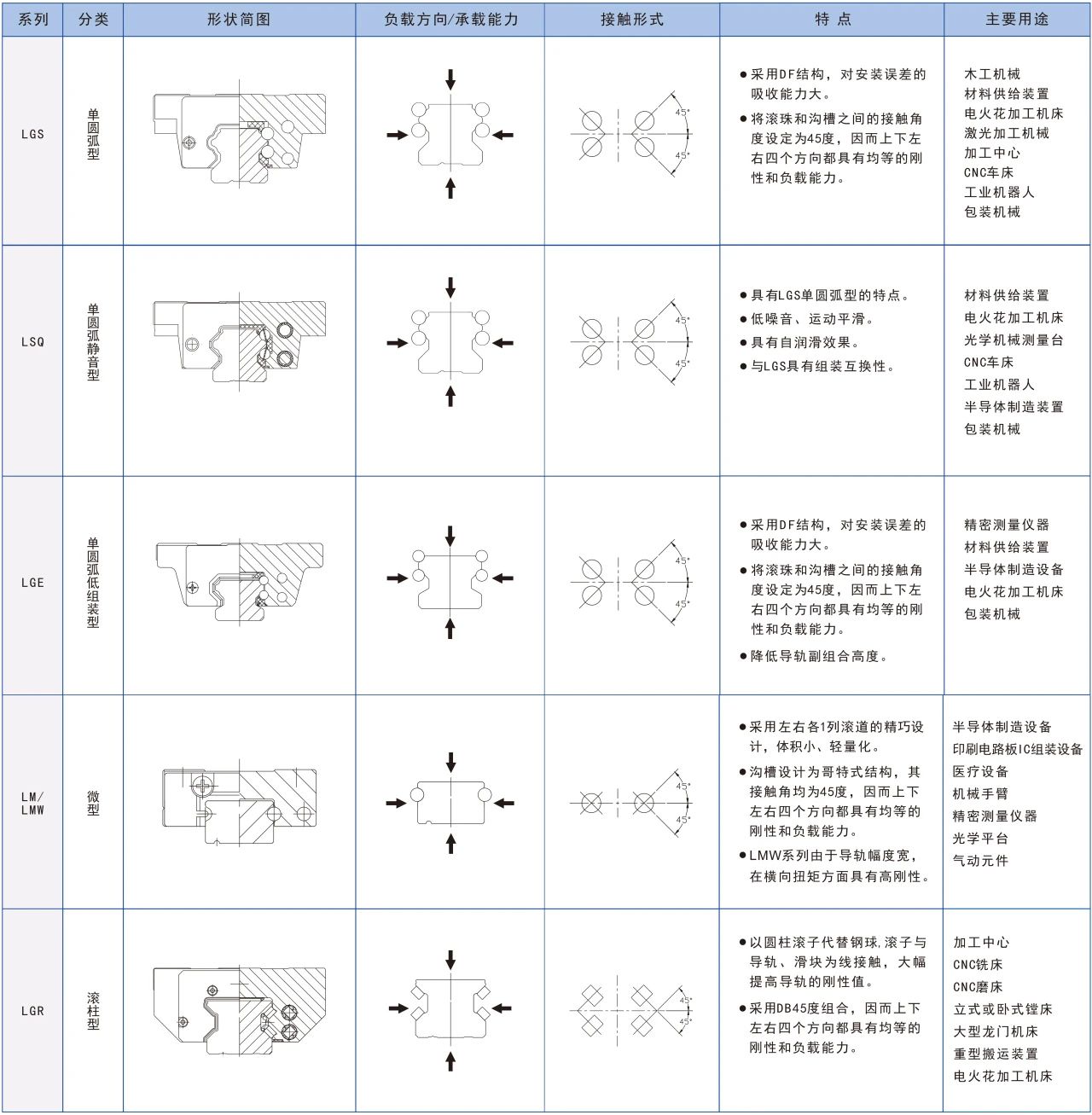 LGS系列滾珠直線導(dǎo)軌副,為四列式單圓弧溝槽接觸,各球列設(shè)計成45度的接觸角,使得導(dǎo)軌副具有四方向等載荷和自動調(diào)心能力的功能,這樣可吸收安裝面的裝配誤差,適用于任何安裝狀態(tài)。并且LGS型導(dǎo)軌副具有較低的摩擦系數(shù),可通過施加足夠的預(yù)壓提高剛性。